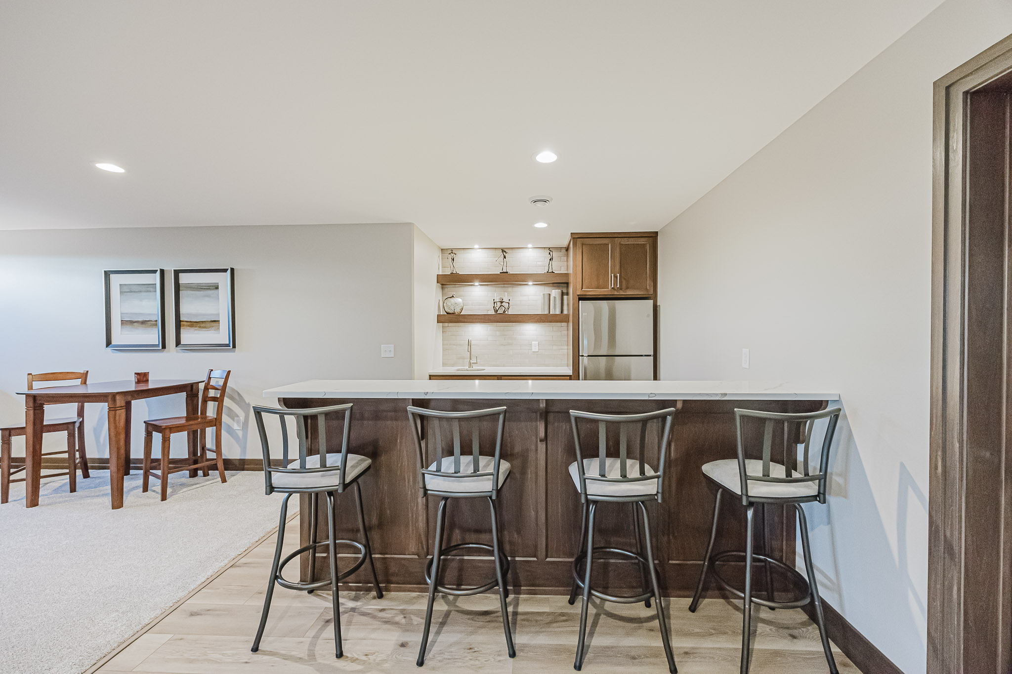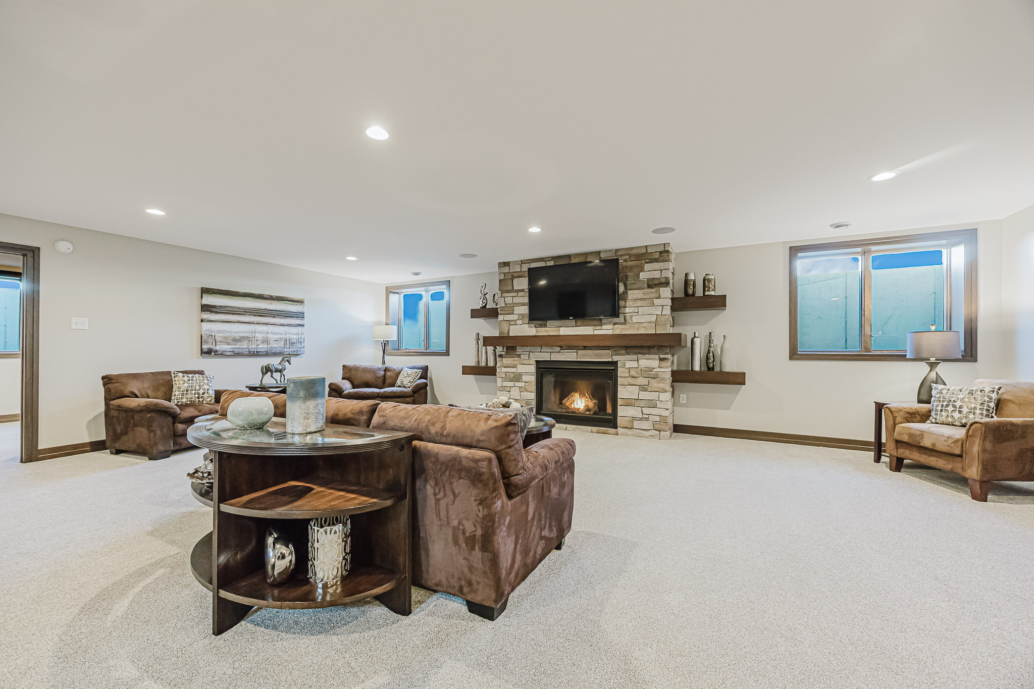 The finished basement has a large open family room with a bar and an additional gas fireplace with stone, a custom mantel and floating shelves. Both basement bedrooms have spacious closets. The home also contains an additional finished storage area/optional 2nd laundry room with laundry hook-ups in the basement.