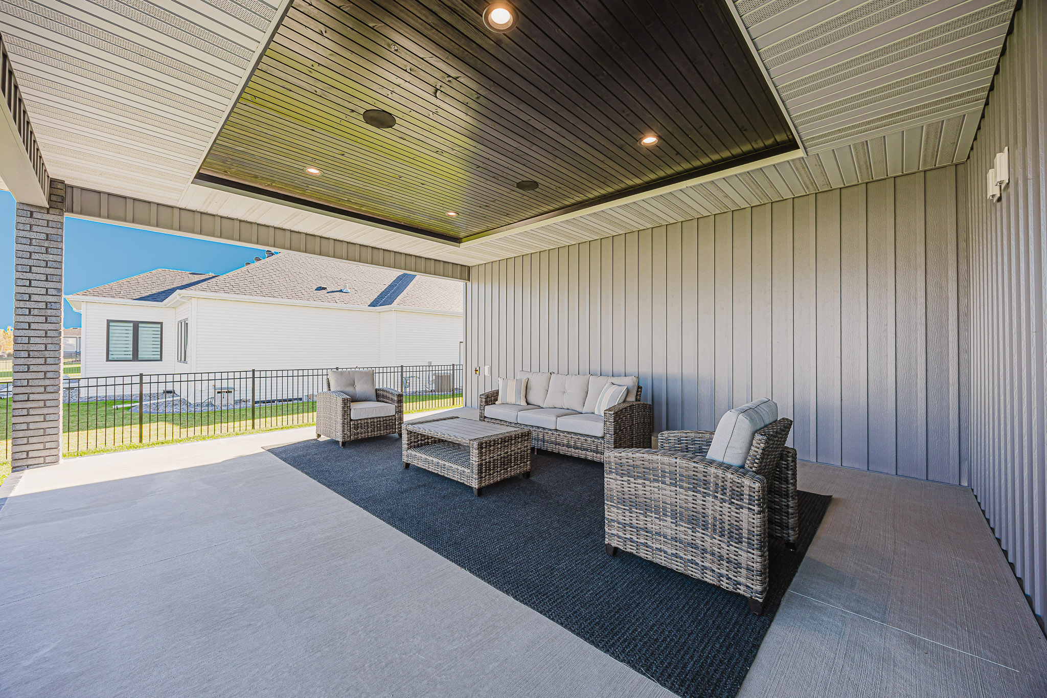 The home features seamless steel siding and a covered porch off of the dining room. The finished oversized triple stall garage can fit 4 cars plus additional room. The garage features a gas garage heater and a floor drain.